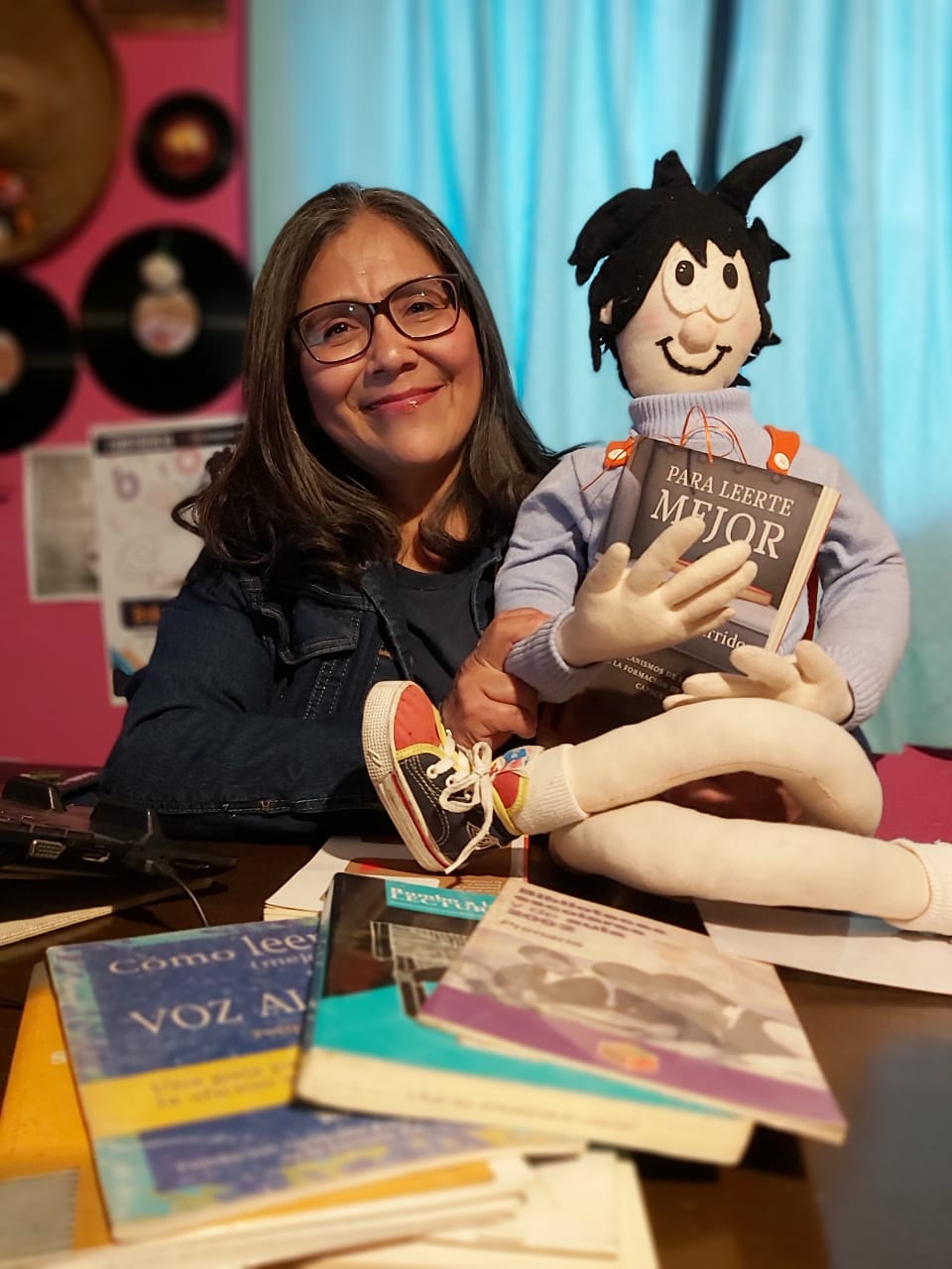 Es un muñequito de tela, él cobra vida al tener contacto con los libros.